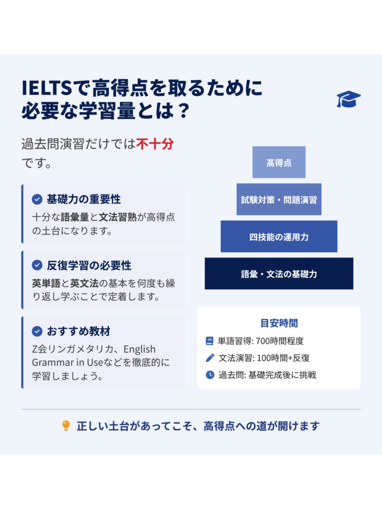 IELTS対策においてまず重要なのは、こうした英単語と英文法の基礎力を身につける時間を設けることです。