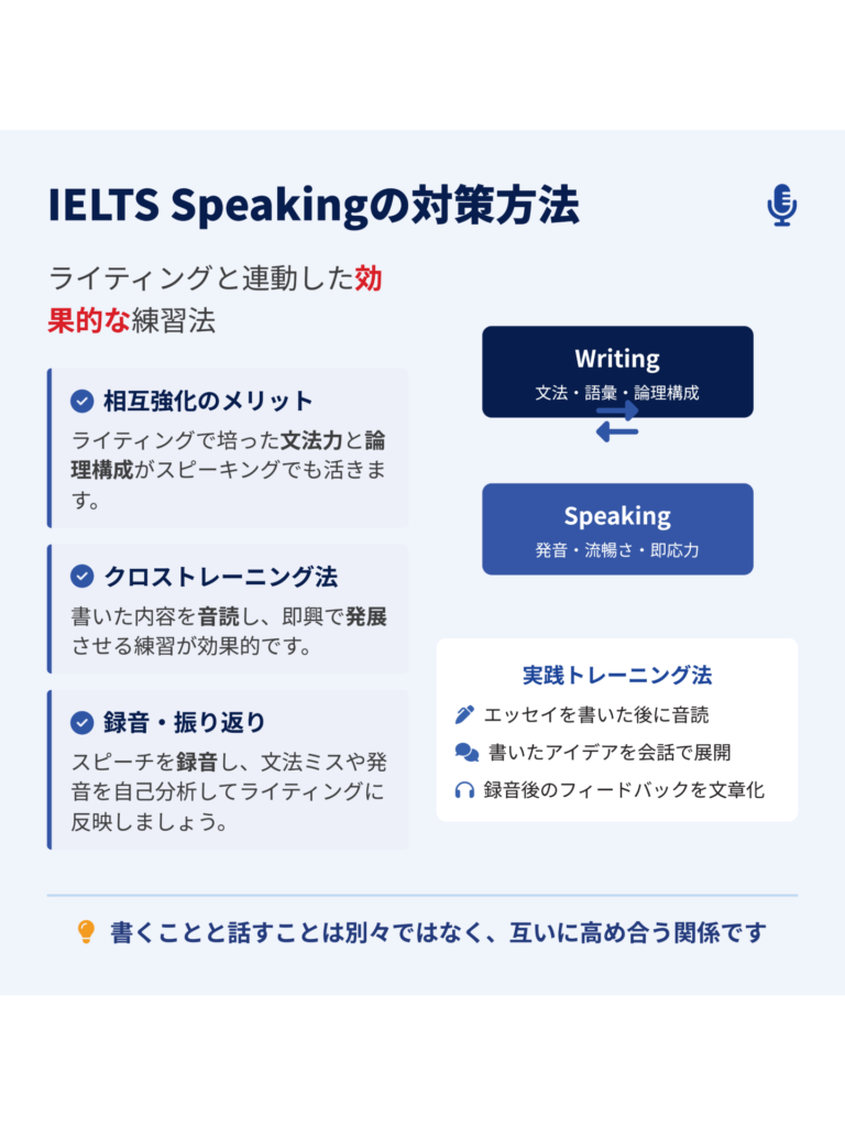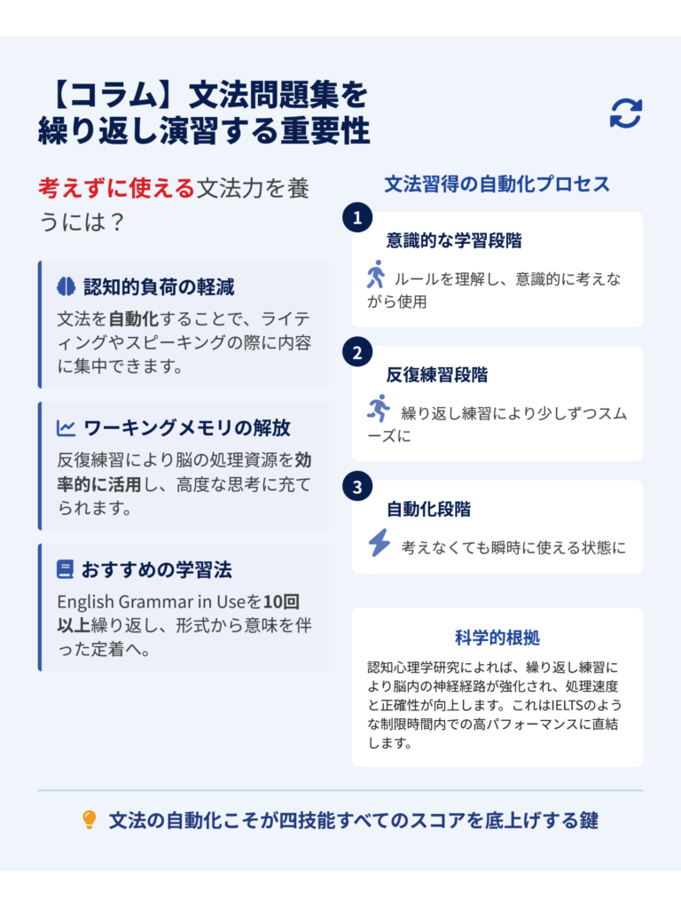 このプロセスを繰り返すことで、単なる文法知識が定着するだけでなく、その知識を自然に使えるレベル、すなわち自動化された運用能力へとつながっていきます。こうした運用力は、IELTSのようにライティングやスピーキングの即時処理が求められる試験では、とりわけ重要な基礎となります。