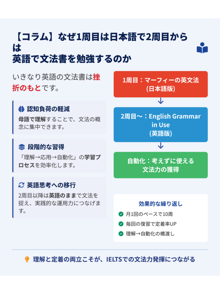 受験生の皆さんには、まず『マーフィーの英文法』(日本語版)を丁寧に読み込み、その後”English Grammar in Use”を何周も繰り返すという学習法を強くおすすめします。結果として、正確で流暢な英語運用力の土台が築かれ、IELTSにおいても安定して高いスコアを獲得できる力につながっていくはずです。