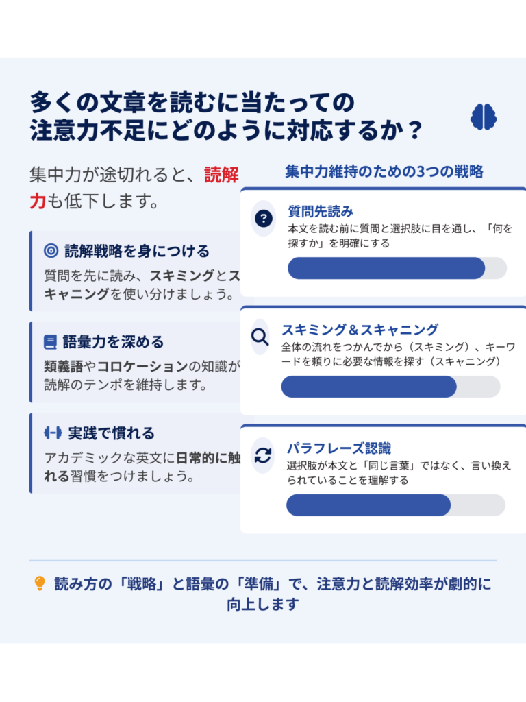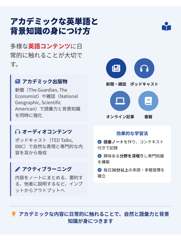 したがって、単語帳で単語だけを切り離して覚えるのではなく、アカデミックな文章の中で繰り返し出会いながら、文脈を通じて語彙を増やす学習法が、より効率的で本質的な語彙力の習得につながります。