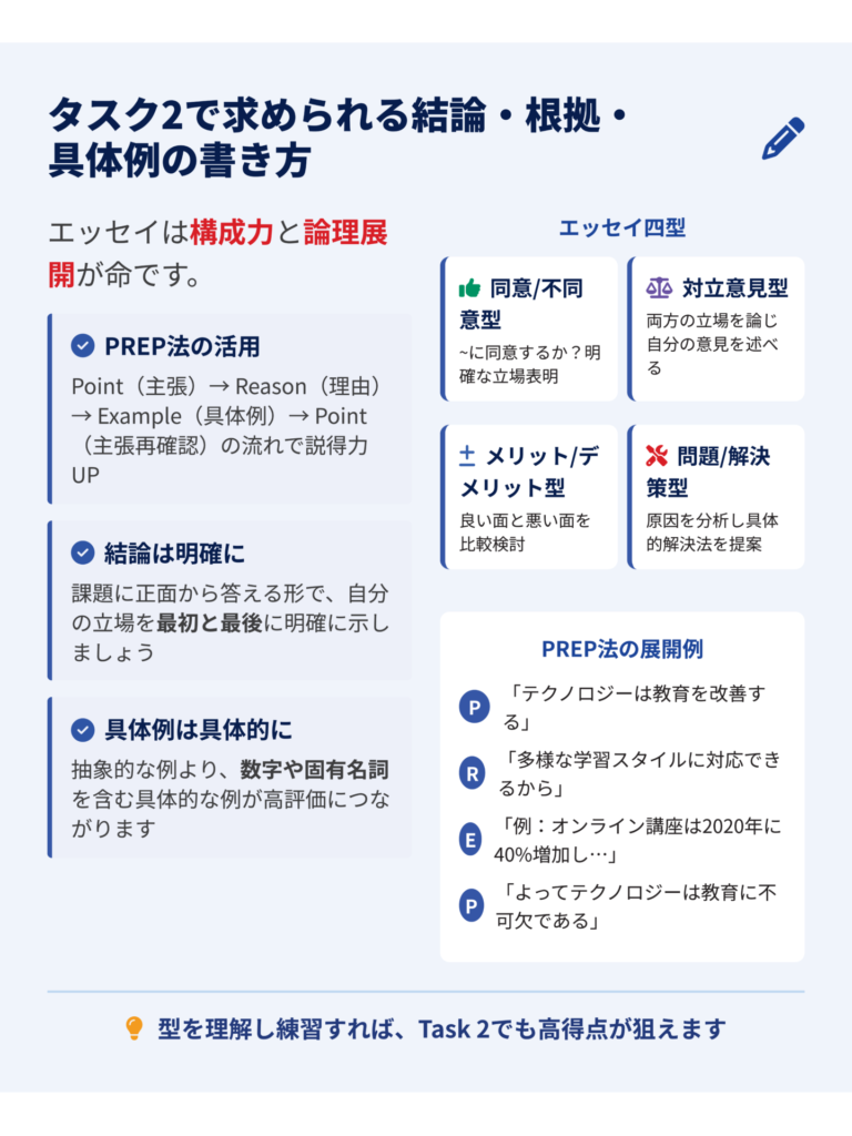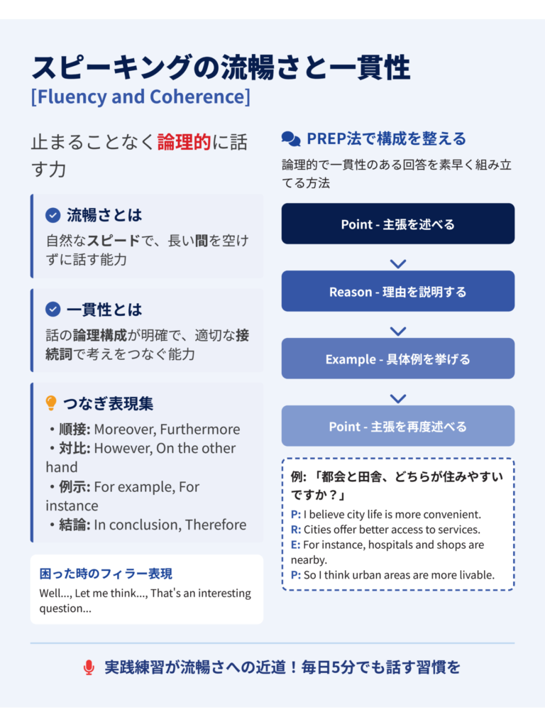 PREP(Point – Reason – Example – Point)という構成を意識することで、論理的で説得力のある答えができます。