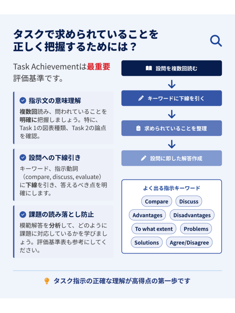 IELTSのような試験においては、日本の一般的な大学入試のように英単語・英文法という観点から間違いのない内容を書けば点数が上がるというものではありません。