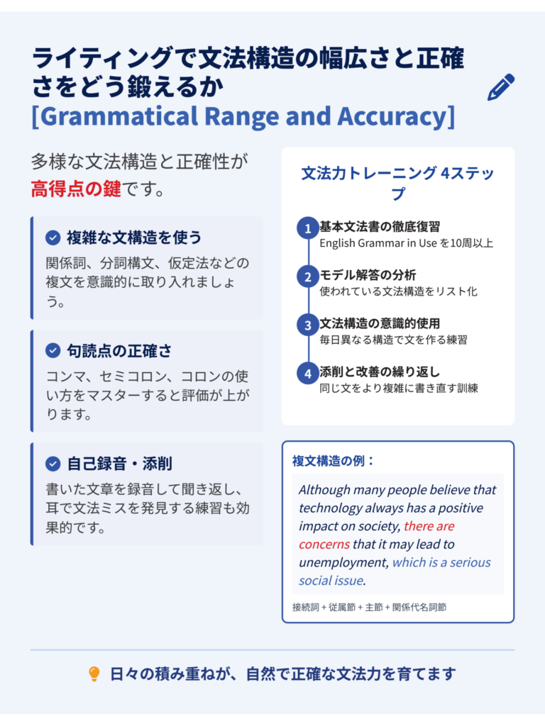 ✔ 文法力(Grammatical Range and Accuracy)