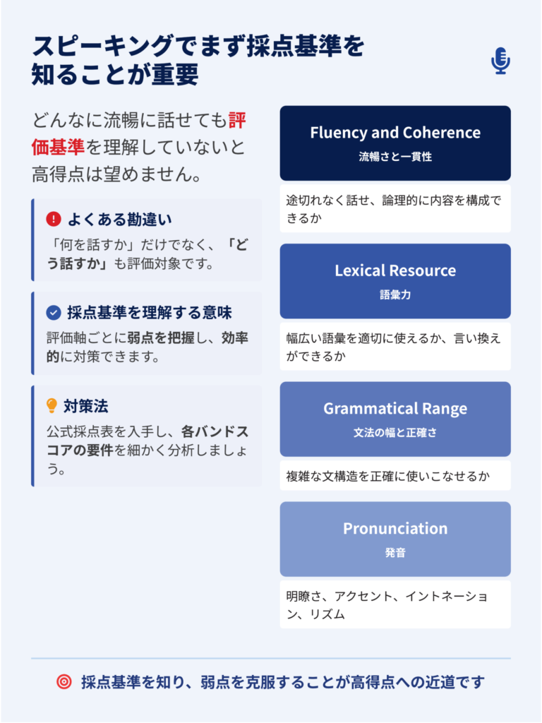IELTSの採点方法としては、まずある程度の英単語量と英文法の習熟があった上で、それを前提としてそれらをどう運用して四技能の能力を示せているかということを示すことによって、初めて点数が上がるというものです。