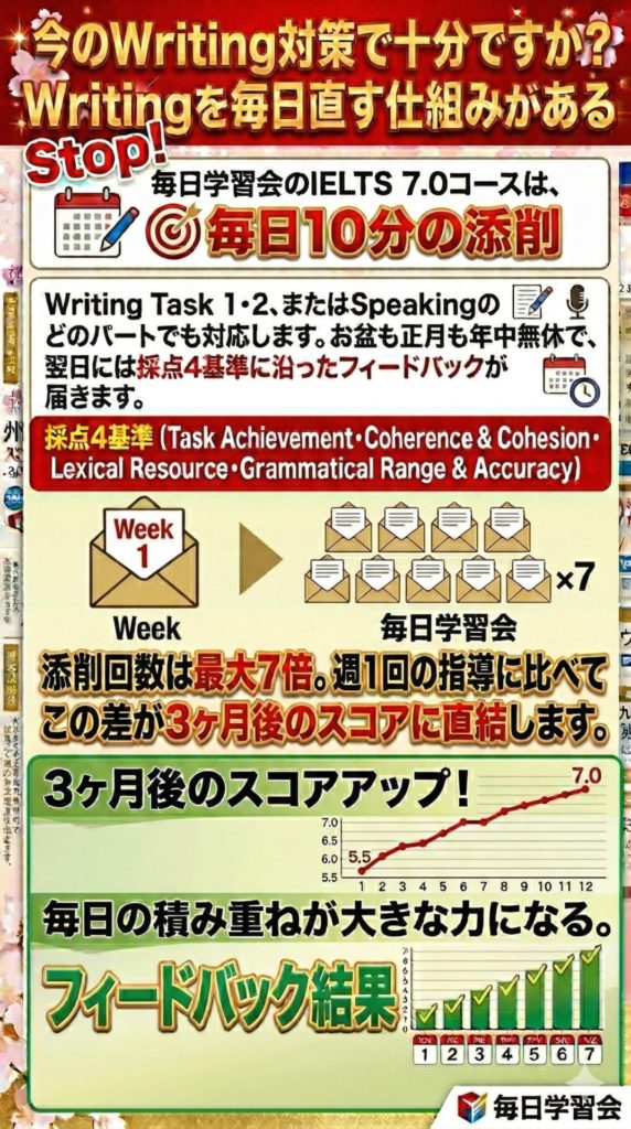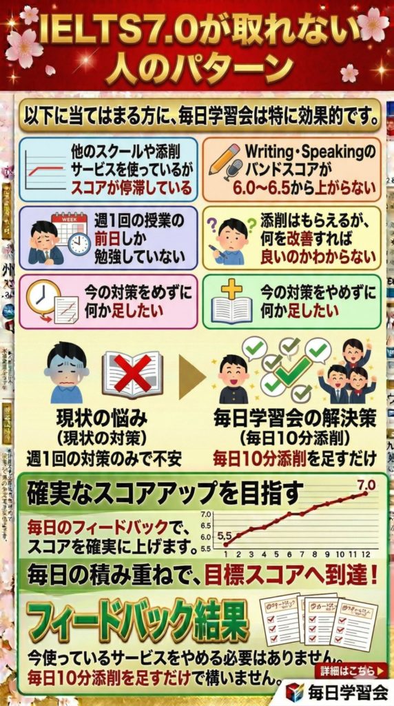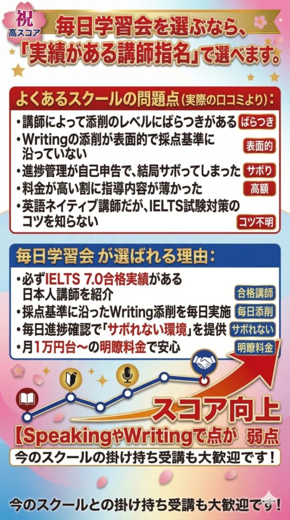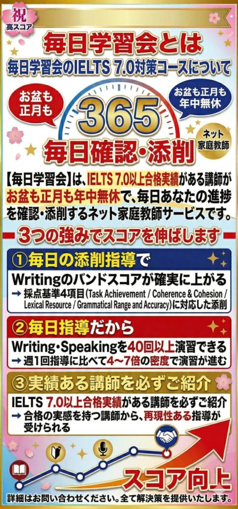 毎日学習会でもIELTSを活用して合格を勝ち取った生徒さんがいらっしゃいます。
