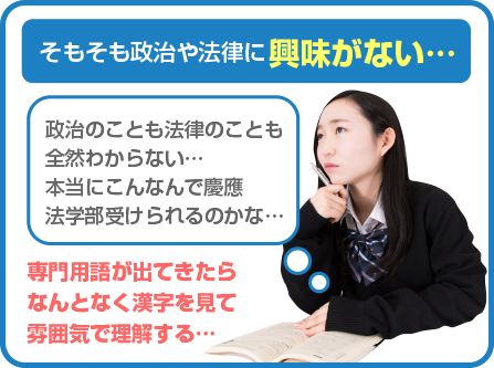 慶應法学部に入りたい……でも実は、政治学や法律学にはまったく興味がない……。慶應法学部FIT入試を受けるあなたでも、実のところそういうふうに思っていることは多いのではないかと思います。実際、慶應法学部FIT入試を受ける人の多くは、内申や英語資格のスコアなどの制約がなかったり、慶應SFCAOほど過去の活動実績が最重要視されないことから、慶應法学部FIT入試受験を選んでいるという経緯があります。これは実際の合格者であっても、受験を決めた段階ではそういった方は少なくありません。