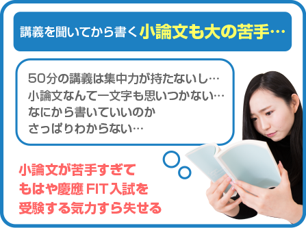 私はFIT入試の二次対策が苦手で、その中でも小論文の論理が一貫していないという大きな弱点がありました。毎日10分の授業で小論文の添削をして頂けて、普段の塾の授業外で自習として二次対策をすることが出来ました。試験の前日にも、面接練習をしたのですがそこで話した時事問題が試験に出てきて驚いてしまいました。