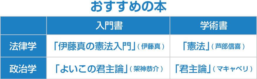 とはいえ、やはり慶應法学部FIT入試では、論述問題やグループ討論(A方式)・面接(B方式)を通じて、政治学・法律学への興味が十分にあるかを試されます。ですから、こうした問題をスラスラ解くことができる程度の知識量はやはり必要です。毎日学習会ではまず、興味のあるなしに関わらず、政治学・法律学それぞれ基本的な入門書を一冊読んでいただきます。政治学であればマキャベリの君主論の入門書(架神恭介さんの「よいこの君主論」)、法律学であれば学部入試段階であれば憲法学の入門書(伊藤真先生の「憲法入門」)が理解できれば十分です。これらの本は政治学・法律学の基礎知識がまったくない方でも問題なく読み進めることができる程度にはわかりやすい本ですので是非一読しましょう。その上で、できればこれらの本のベースとなったマキャベリの「君主論」と芦部先生の「憲法」は多少難しいですがぜひとも読むべきです。最初は意味がわからなくても一通り一読してどこになにが書いてあるかを理解するだけでも十分です。