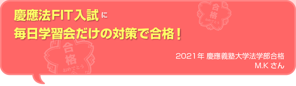 私はこうして慶應義塾大学法学部法律学科に合格することが出来ました。短期間でFIT入試を合格できたのは毎日学習会のサポートがあったおかげです。ありがとうございました。最後にこの体験記を見てFIT入試に少しでも興味を持ったのなら自分で調べてみて下さい。過去問も掲載されています。その上で早めに受けるか決めましょう。時間があるほど合格する確率は高いです。明確な目標とそれを実現しようという情熱が慶應義塾大学に伝われば合格すると思います。何かあれば毎日学習会の先生方に相談してください。これから大学受験に挑戦する皆さん頑張ってください!