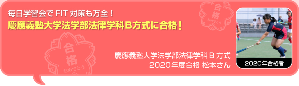 また、fit入試出願後からは慶應文学部自己推薦入試対策に英作文の授業も始めました。この指導も細かいところまで指摘してくださる上、模範解答ではさまざまな表現を交えて下さっていたので語彙のレパートリーが増えてよかったです。ただいいところでもあるのですが、毎日学習会はネット上がメインなので二次の面接対策や、グループディスカッション対策は毎日学習会で行っている東京でのイベントなど対面で練習する場を自ら積極的に取り入れて死に物狂いで対策するべきだと思います。加えて、この入試は本当に自分を成長させてくれますがその分辛いことも多いと思います。私も一次試験対策をしている時は周りの友達がインターハイ優勝選手や日本代表だらけで自信をほんとうに無くしてしまったし、書類作成時は一般との両立が崩れてしまいなんでこんな試験受けることにしたんだろうとほんとうに苦しかった時期がありました。おそらく推薦に挑戦したことで一般入試一本で行く同級生の2倍は辛い経験をしたのではないかなと思っています。でも、腹をくくり、直前期は学校を休ませてもらって朝から終電まで塾にこもり対策に励むなど、もうこれ以上はできないというくらいに全力で取り組んだ結果、本当に信じられないくらいの幸せが待っていました。努力は報われるのだと思います。どんな状況でも自分を信じて頑張ってください!