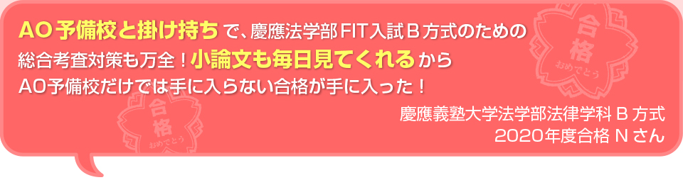 これらの実績はほんとうにfit入試の際に武器になったので、高校1.2年生の方は今すぐ!なんでも挑戦してみるべきだと思います!そして慶應義塾大学法学部法律学科に一次ではA.B両方式、最終的にはB方式で合格することができました。対策としては他にももう一つAO対策の塾には通っていたのですが、毎日学習会の方では慶應法学部fit入試B方式のための総合考査対策を行いました。毎日学習会には6月に入会しました。小論文の添削をお願いできる塾を探していたのですが、毎日、そして一回千円で添削してくれるシステムは貴重で魅力的だったので入会しました。授業では総合考査10年分を二、三周、OKが出るまで行いました。時には先生とだいぶ議論が過熱してしまいお手数をおかけしてしまいましたが、私の納得がいくまで先生は説明してくださり、すごく論立ての力がついたことを実感しています。本番では総合考査1のグラフ問題が試験終了後泣き出す友達もいたレベルに難化した?のですが、毎日学習会でやってきたことを信じてなんとか解き終えることができました。また、私は一般入試でも慶應義塾大学を狙っていたために過去問演習開始後は毎日のペースで小論文をかけなくなってしまった際も、一回一回の授業が濃かったために安心して力を伸ばすことができました。