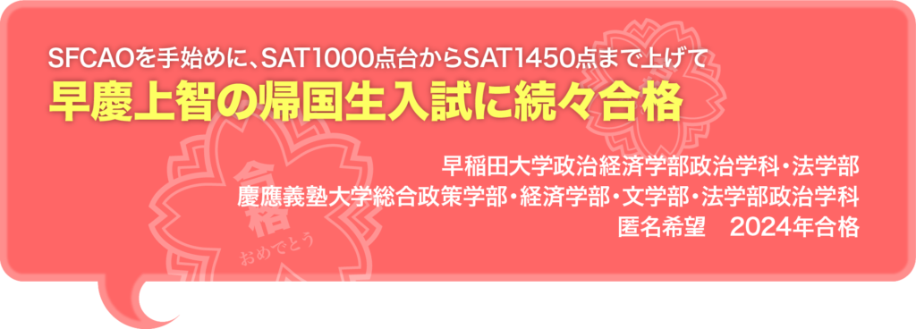 毎日学習会では毎年SATのスコアを元に、早稲田・慶應・上智に合格する生徒さんが多数おります。