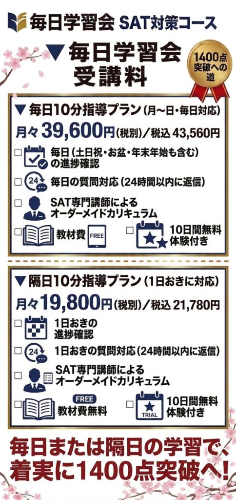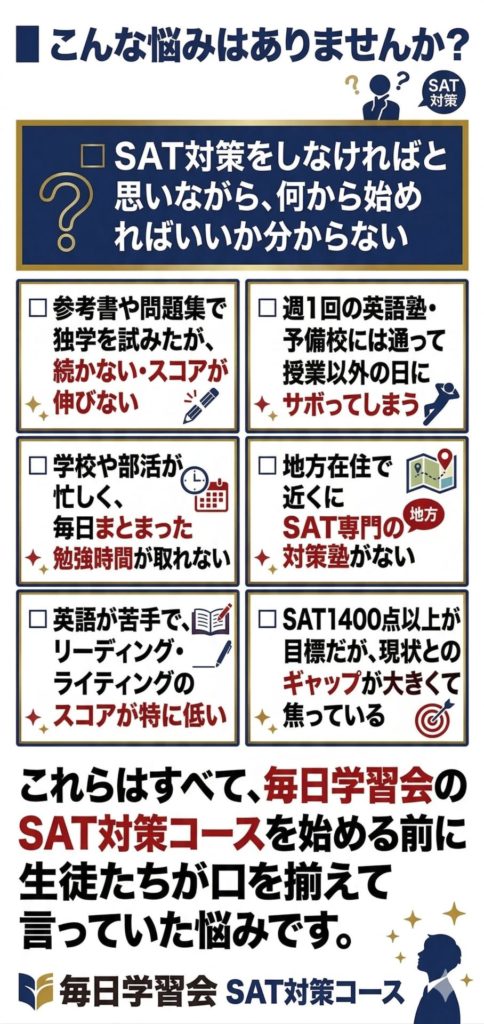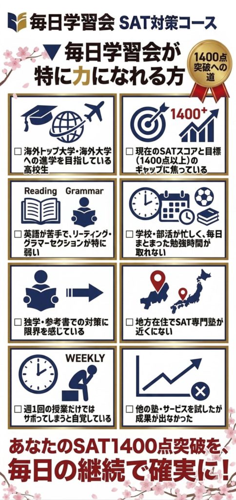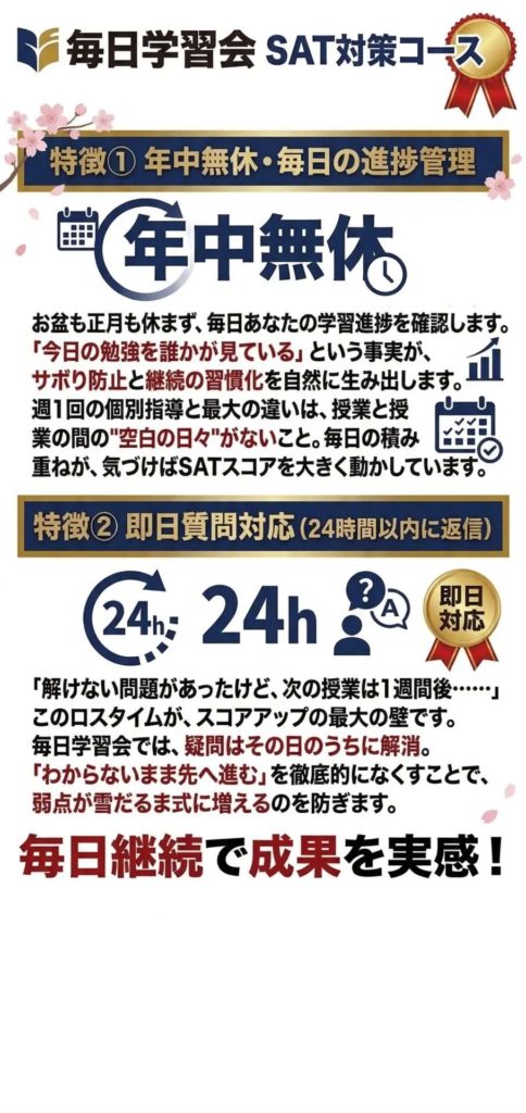 日本にいながらSAT対策 毎日学習会の模擬試験と解説を利用することで、日本にいながらSATの対策を効率よく進めることができます。特に、模擬試験を通じての繰り返し学習が非常に有効であり、模擬試験を多くこなすことで、自分の弱点を洗い出し、集中的に改善することが可能です。