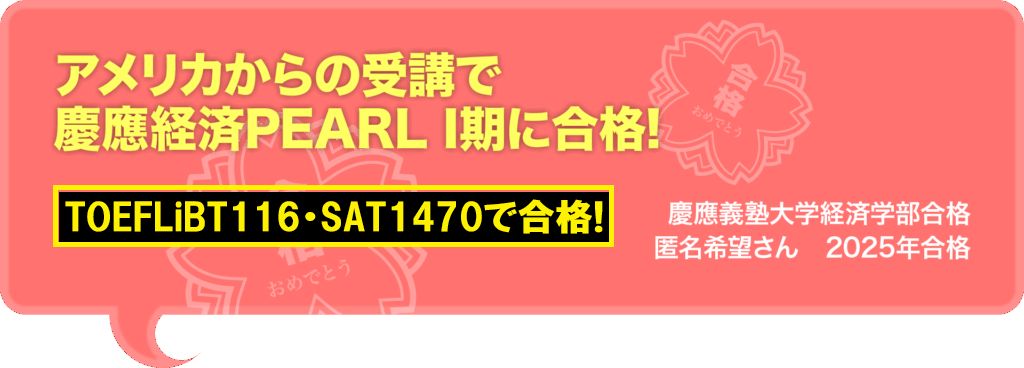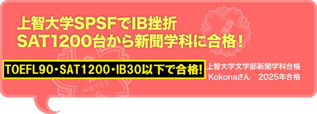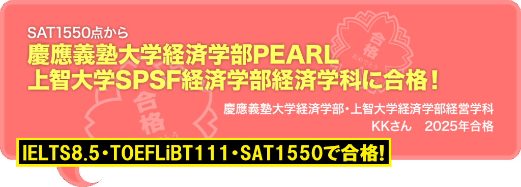 私はインターナショナルスクールに在学中に国際バカロレアプログラムで大学受験することを考えていましたが、あまり良い結果が出せず、SATに切り替えました。最初の方は、一人で過去の問題やSATのテキストを使って、自力で勉強し、受けました。ですが、良い結果が得られませんでした。その時に、毎日学習を知り、申し込みました。授業が始まり、常に、勉強のテキストや宿題の量を決めていただき、毎日取り組むことで、SATのテストの点数も上がりました。特に、私にとってよかった点は、毎日塾長から、学習の進み具合や質問等の確認があり、予定を組むことができました。また、受験に関しても、積極的にスケジュールを組んでくださったり、SATの豊富な教材の提案をしてくれました。志望理由書を書く中で重要なポイントやテンプレートなども提示してくれました。これのおかげで、私は志望動機やこれから大学には入ってしたいことなどを具体的に書くことができました。大学の志望理由書を書く上で、自力ではできないことまでサポートしていただきました。具体的には、書き方などを提案してくださり、入念に何回もチェックや面接についても予想問題の解答の練習もしてくださいました。授業に関しては、SAT受験の経験豊富な現役の先生が多く、質問のときかたやコツを教えてくださいました。また、先生達がSATの勉強をしていた時に使用していた教材などを提案してくれるため、信頼もできました。さらに、先生達も英語が話せるバイリンガルが多い為、正確でわかりやすい解説や説明をしてくれました。そのため、コミュニケーションをスムーズに行うことできました。授業がない日の宿題も担当の先生より出題があり、それに沿って授業をスムーズに進めていくことができました。そして、質問があったり、不安なことなど悩みごとなども気楽に話せる環境がすごく私にとって助かりました。ラインで常に手伝っていただいたり、zoomなどでもお話しして手伝っていただきました。私は、今回、上智大学のSPSFの中の二つの学部を受けましたが、最初の方は一つだけを受けるつもりでした。ですが、塾長に相談したところ、どこに受かるかわからないため、もう一つ受ける方がいいと言われました。その相談のおかげで、私は二つの学部を受けました。そして塾長からおすすめしていただいたもう一つの学部に合格しました。このように、何個受けるかなども、積極的に教えていただき、すごく助かり、大きなサポートになりました。先生たちのわかりやすい教え方やコツ、それに加え、志望理由書の書き方なども教えてくださったことが一番の助けになったと思います。すごく感謝しています。