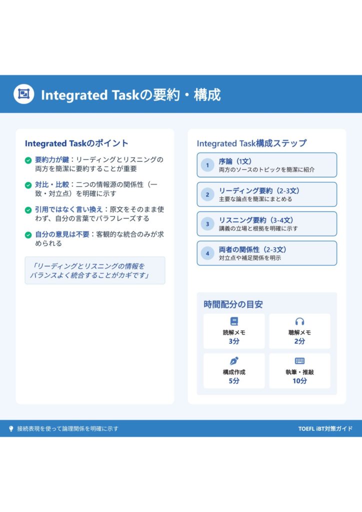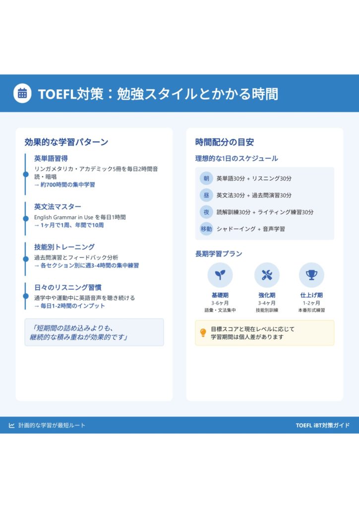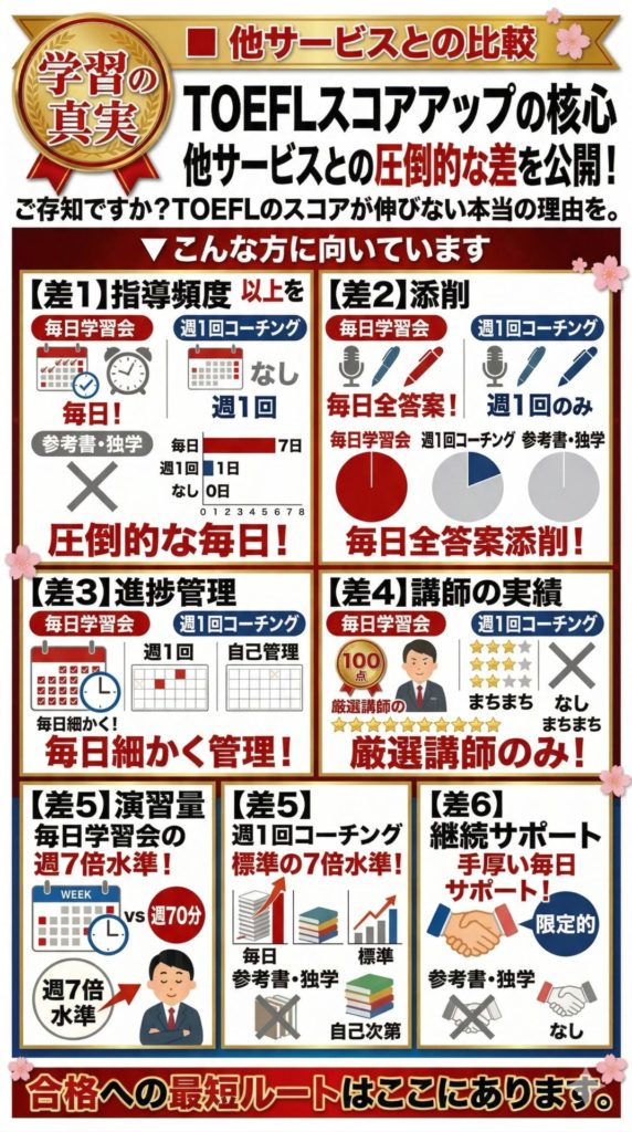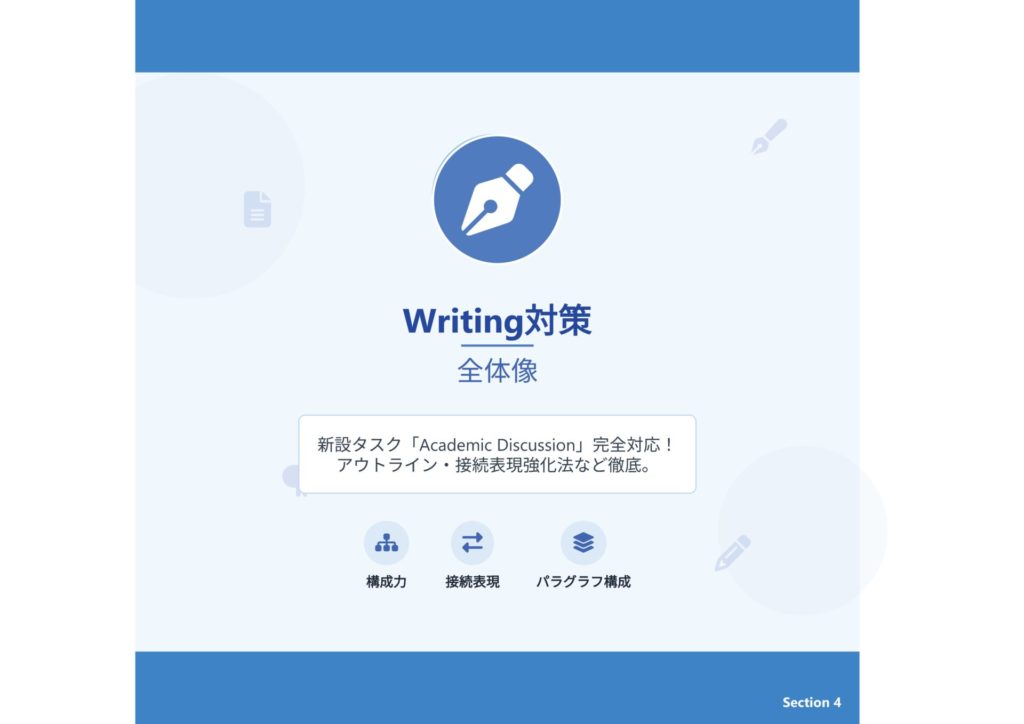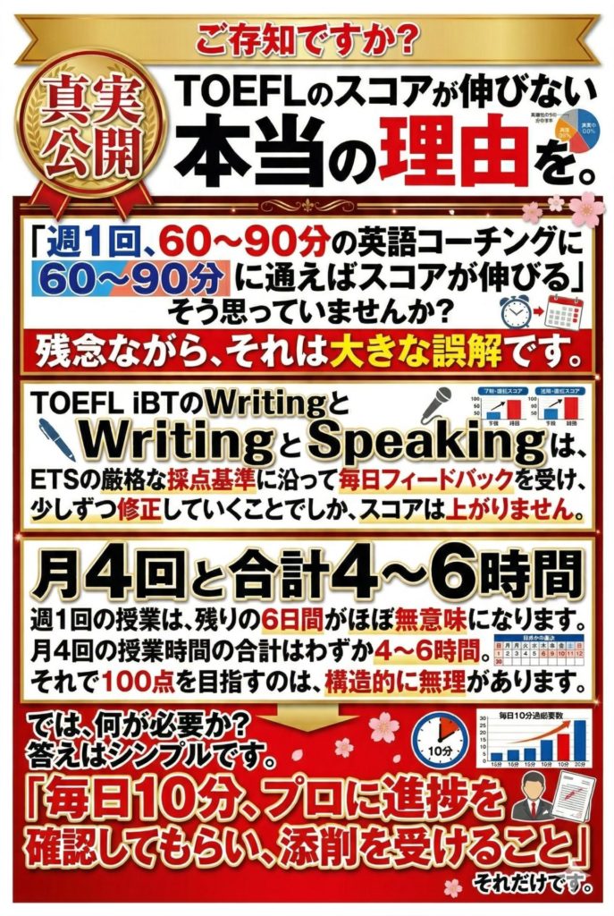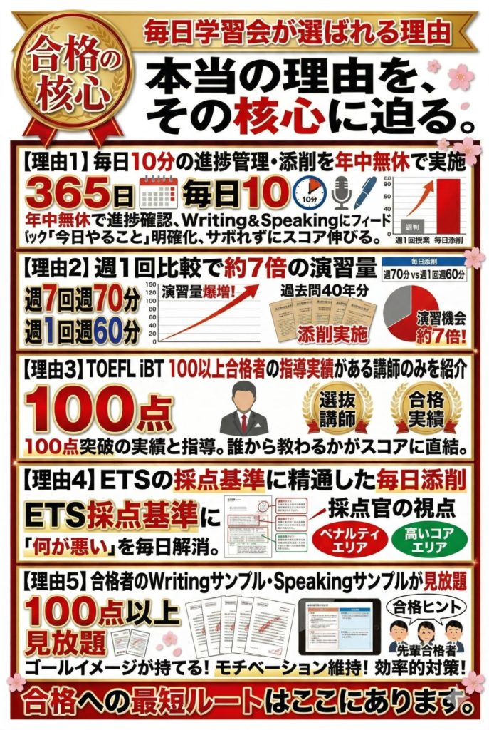 TOEFL iBTは、アメリカ・カナダの大学進学に用いる英語民間試験であり、高得点を取るには英語4技能を高いレベルに持って行く必要があります。加えて、2026年1月から大幅に改変された新制度への以降も予定されており、新制度への準備も必要です。