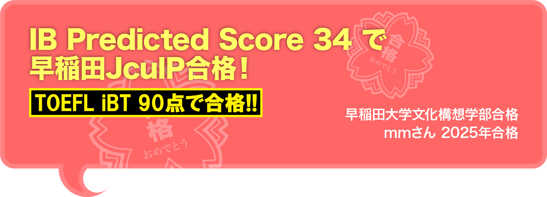 私は、南米の非英語圏のインターナショナルスクールに通いながら九月入学の早稲田大学JculP(文化構想学部)に合格することが出来ました!IBのpredicted scoreに影響する大切な時期と、早稲田に提出する志望理由書の作成時期が重なり、とても大変でした。しかし、それらを両立させなければならないことは初めから分かっていました。そんな中、私を支えてくれたのは毎日学習会の林先生と現役大学生の先生方でした。
